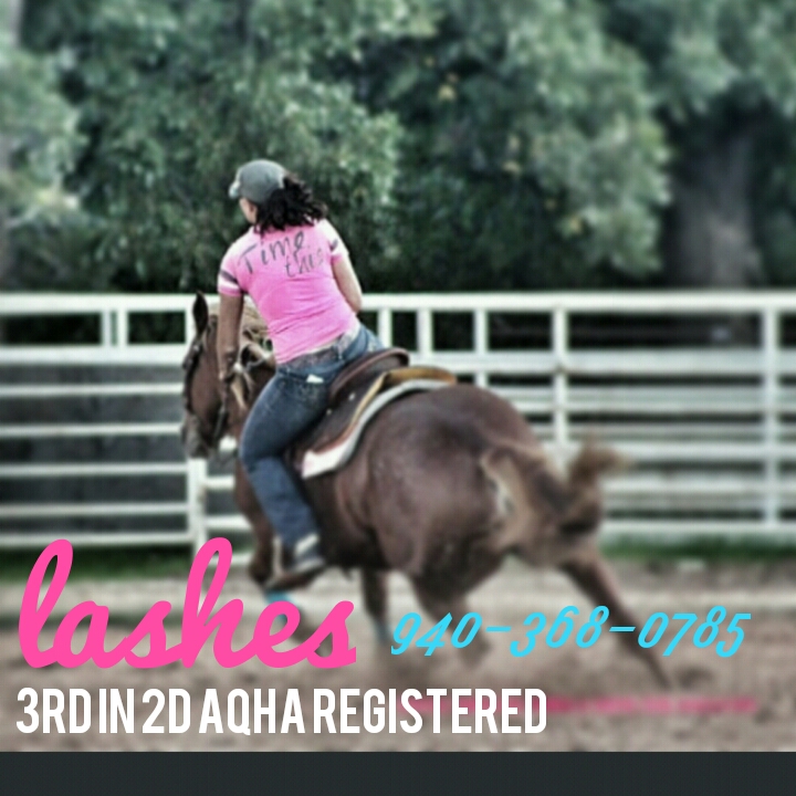 Lashes is another Dynasty horse that we can't wait to brag about with her new owner. She is 10 years old and the easiest horse to ride and own. She is an absolute doll to be around, manners deluxe and that is before you ever even take her down the alley way. She is currently being hauled and seasoned amongst the toughest horses in north texas and doing great. She will be a fantastic step up horse for a youth rider with huge goals and will be a great horse for any serious competitor. She walks down the alley until you are ready and always stops with ease!